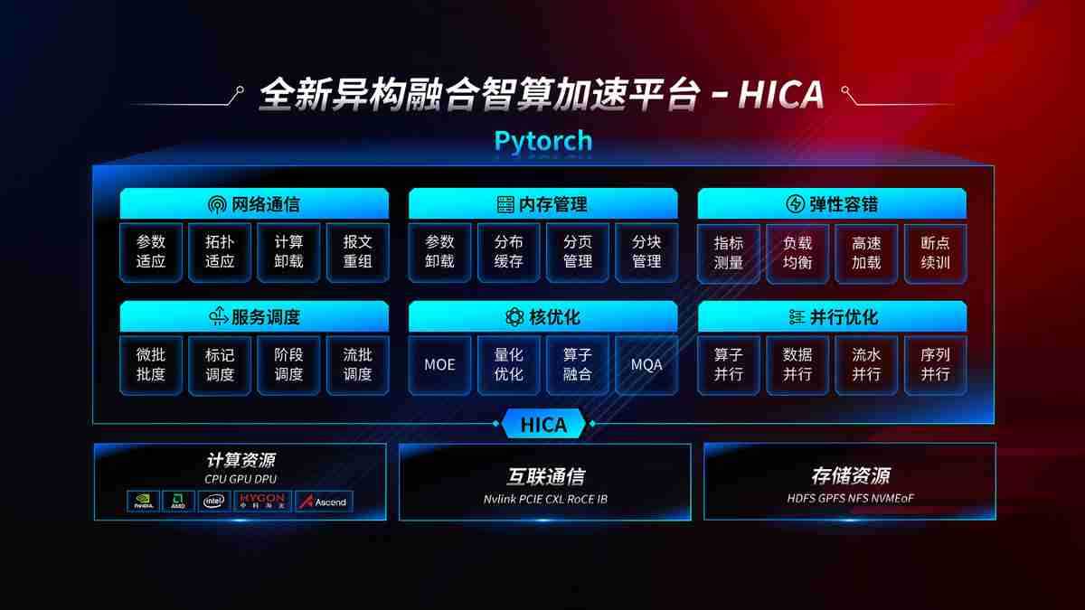 通过自研的服务层、、、中间适配层、、、、以及调度编排算法,,,采用数据并行、、、、模型并行等多种并行方式,,,,把并行计算任务进行有效的分解,,,使其分别由相应的软件栈和算力资源来承接。。。。当GPU资源变化,,,,HICA可以实时动态调度计算子任务并调整模型拓扑和架构,,以充分聚合各种算力资源。。