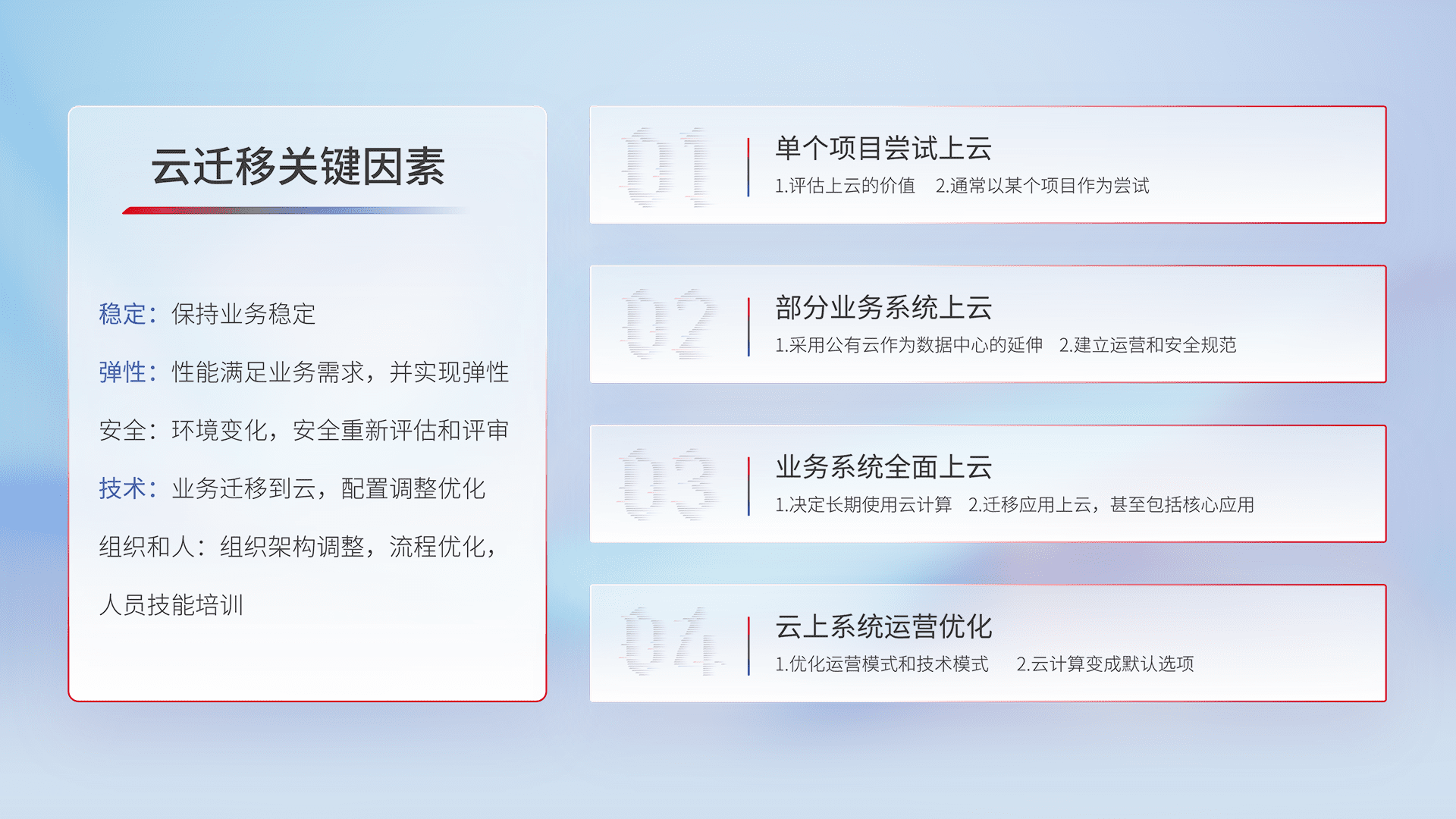 结合实际业务,,,从规划设计、、云平台选型、、云原生改造、、数据迁移、、、集成交付,,迁移全过程为客户识别最佳上云路径,,,做好风险识别管理,,,,设计网络架构、、、身份权限、、、、安全审计合规、、、、操作审计、、、日志审计、、、、监控告警策略、、、多站点容灾设计等,,对云上基础设施进行整体规划,,,提升IT治理水平,,,,以满足弹性、、高可用、、、高性能的需求。。。。