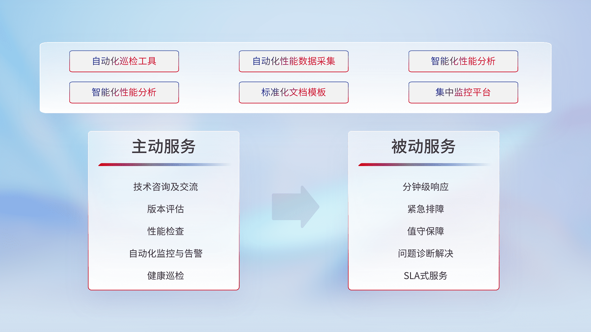 智能化工具和标准化文档,,保障服务质量,,,提供主动服务(包含技术咨询、、版本评估、、、性能检查、、、、自动化监控与告警、、健康巡检)和被动服务包含(分钟级响应、、紧急排障、、值守保障、、、问题诊断解决、、、、SLA服务)。。。。
